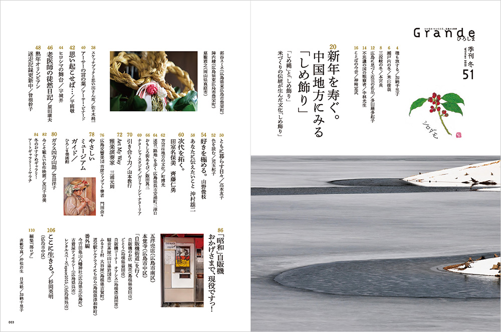 冬号は「しめ飾り」を特集しました。近頃は畳の部屋や床の間のない家も増えましたが、地方には米作りを中心とした農の営みや祭りなどを通して受け継がれてきた「しめ縄」の文化が色濃く残っています。取材を進めると、伝統の技や形のなかにも時代の風が吹き込まれ、大切に受け継がれていることを知りました。中国地方の美しい「しめ飾り」をご覧ください。